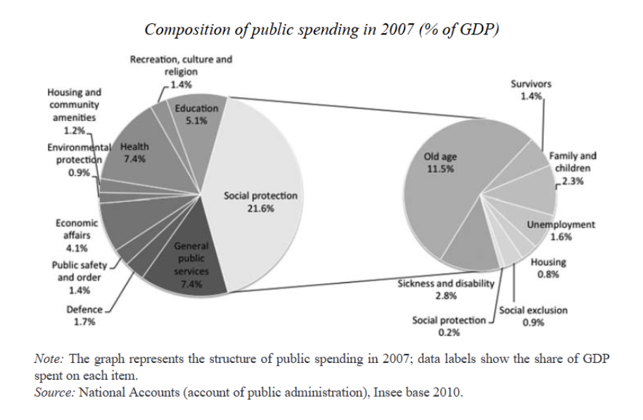These social protections were still evident at the dawn of the financial crisis. French government spending was already high, with social security playing a major role, as seen in the figure below.