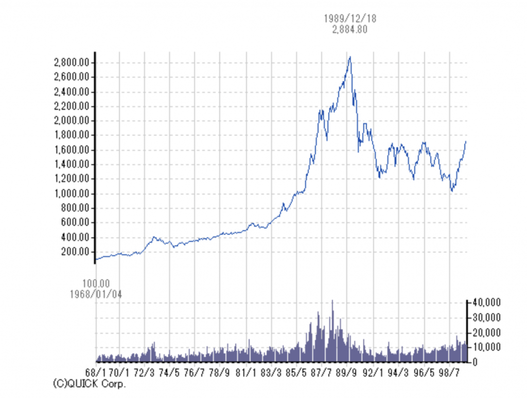 Zaitech is essentially a form of financial engineering, consisting of corporate speculation, facilitated by the emergence of another innovation, tokkin accounts, which according to Chancellor (2000, p.290) “allowed companies to trade securities without paying capital gains tax on it”. This created a financial system where profits were driven by speculative investments made by Japanese firms in the stock market. As these investments were made with “cheap capital” supplied by the increase in land prices, indexes such as the TOPIX were driven to all time highs in December 1989 as shown in Figure 1 (Japan Exchange Group, 2023).