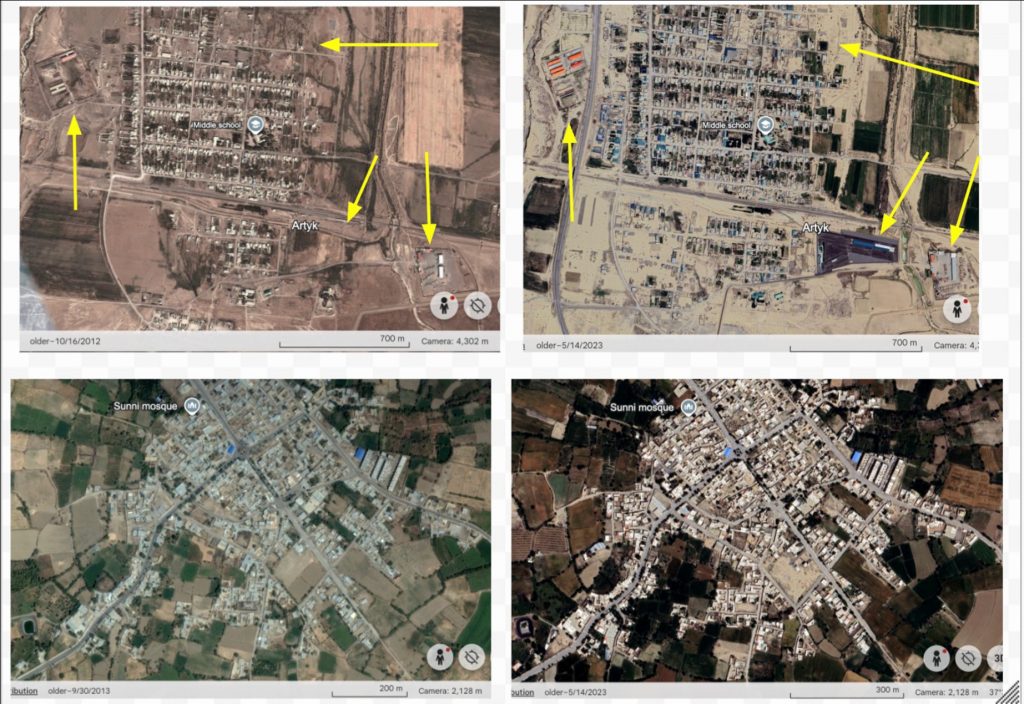 Figure 6: Satellite imagery between approximately 2012-13 and 2016-24 in Artyk, Turkmenistan (top) and Loftabad, Iran (bottom), arrows indicating new industrial construction.