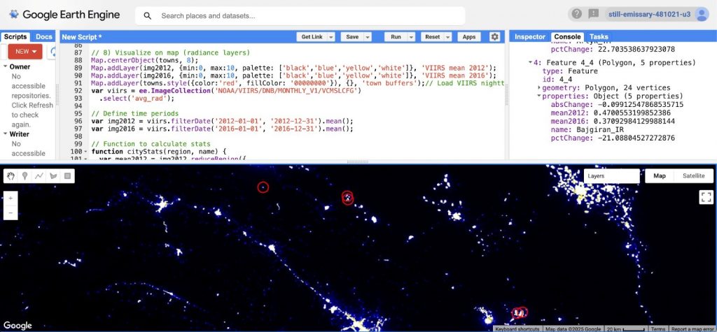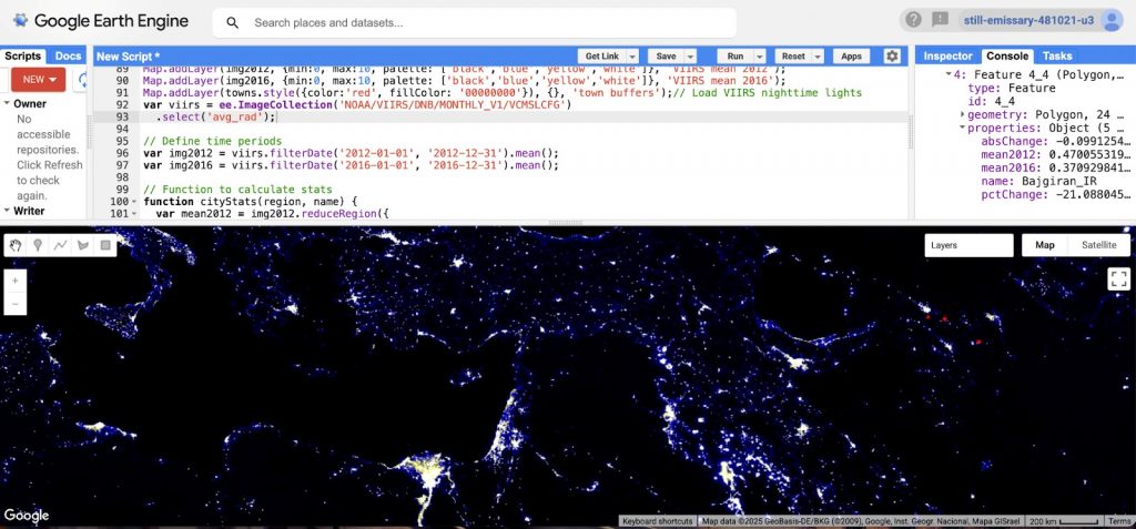 Figure 4: Google Earth Engine analysis in Javascript of light pollution in border towns between Iran and Turkmenistan.