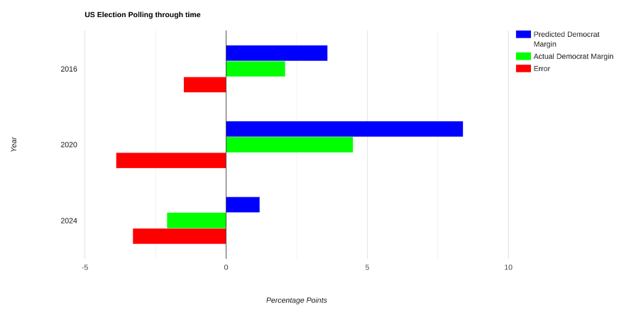 The shift from telephone to online polls, and the characteristics of respective pollee’s, are likely to be a major reason why polls are getting worse over time instead of getting better. The following graph shows the extent to which polls have got worse, using data from the FiveThirtyEight poll tracker (2016) (2020) (2024) and comparing it to the actual election popular vote results.