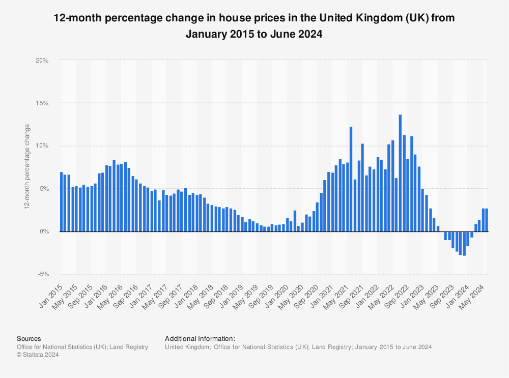 Figure 1: 12-month percentage change in house prices in the United Kingdom (UK) from January 2015 to June 2024 (Land Registry, 2024