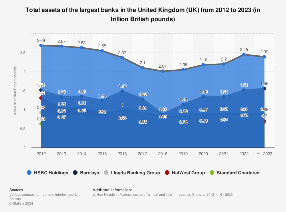 Figure 2: Total assets of the largest banks in the United Kingdom (UK) from 2012 to 2023 (in trillion British pounds). (Statista, 2024