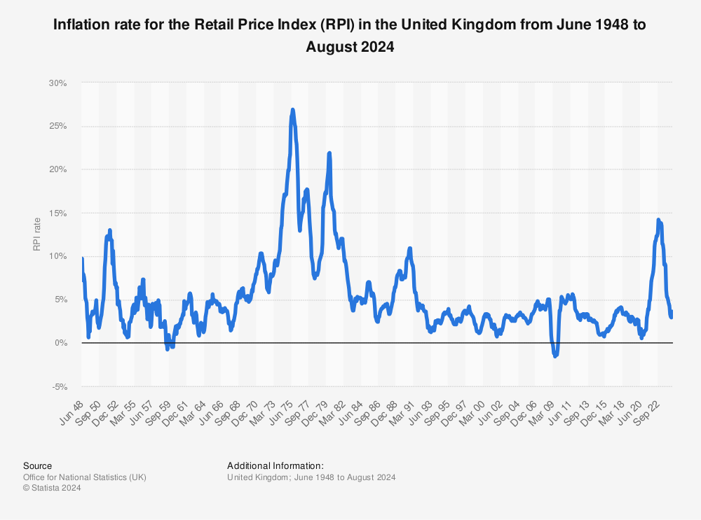 Figure 4: Inflation rate for the Retail Price Index (RPI) in the United Kingdom from June 1948 to August 2024. (Office for National Statistics (UK), 2024