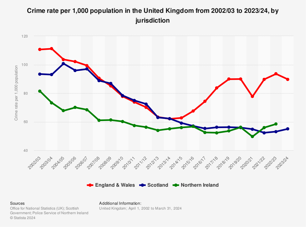 Figure 3: Crime rate per 1,000 population in the United Kingdom from 2002/03 to 2023/24, by jurisdiction (Office for National Statistics (UK), & Scottish Government, & Police Service of Northern Ireland, 2024).